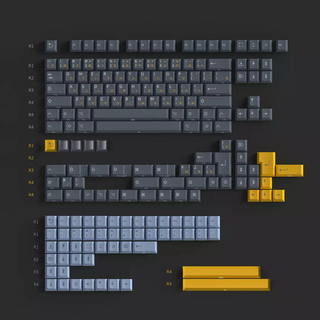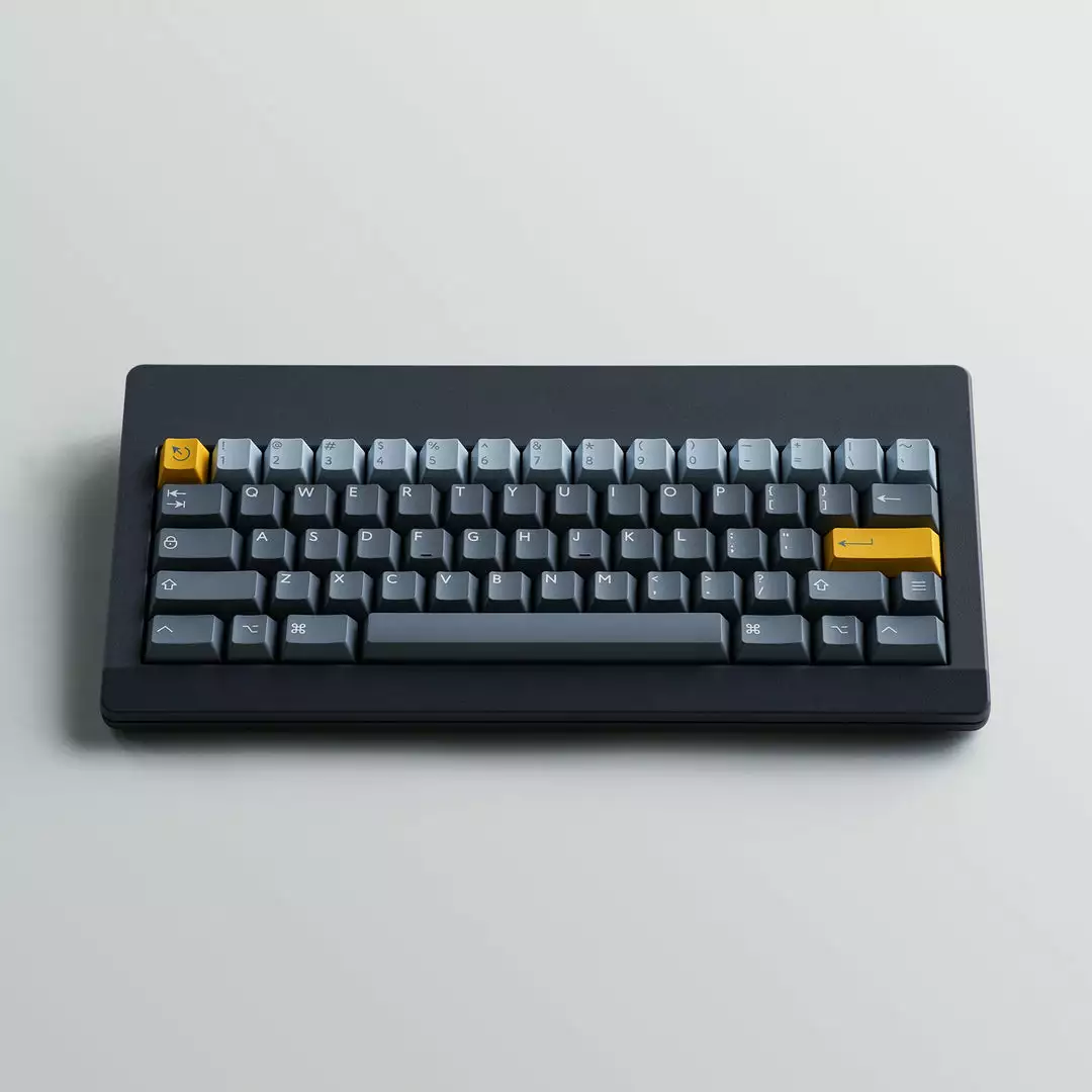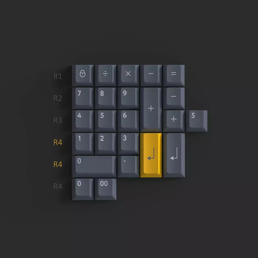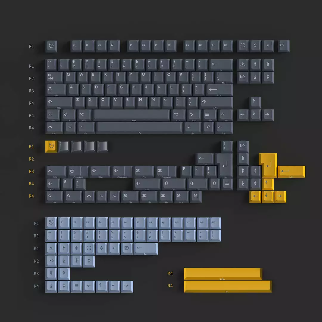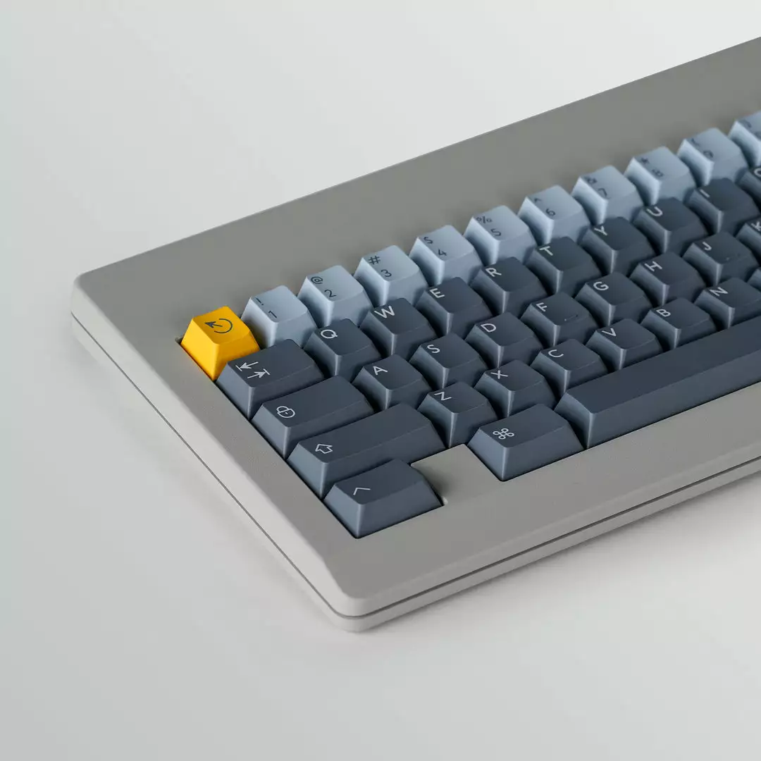 Inspiration: Born from a desire to pay tribute to the first home computers such as the Thomson TO7 or the Canon V20, this set has its roots in industrial design. It’s a vintage looking keyset that pays homage to its predecessors while remaining contemporary. Understated, go-anywhere, its grayscale color scheme matches any keyboard that’s reminiscent of most keyboards seen in the 80s, as well as the yellow accent color which adds a touch of singularity. The triple-shot technology makes it possible to have a different legend color and sub legend color, adding a new touch of uniqueness, in addition to the extra top row with a lighter gray.